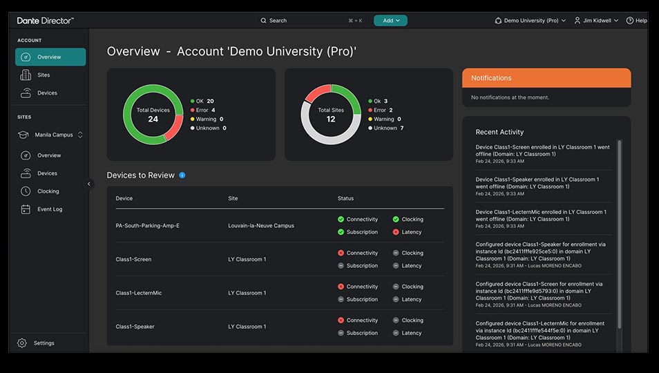 As organisations expand their AV footprints across campuses, office buildings, and global facilities, managing a large number of networked devices has become increasingly complex. Dante Director Professional delivers ‘an easily accessible solution that enables IT and AV teams to monitor device health, diagnose issues remotely, and ensure systems remain operational without requiring on-site presence’.