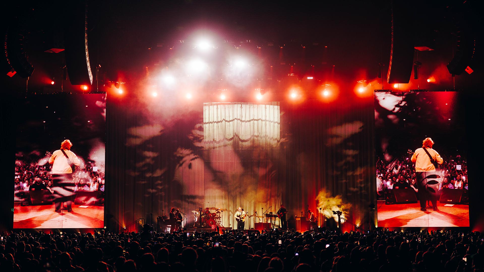There are six onstage: Aiden Halliday, the MD, who plays keys and guitar; Freddy Sheed plays drums; Aidan Beattie plays bass and keys; Ciaran McEneny plays guitar and keys; Andy Black plays electric guitar and lap steel; and Capaldi, who also plays electric and acoustic guitar.