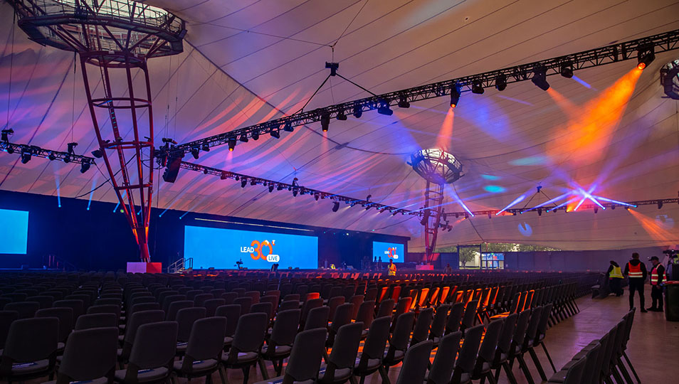 The scope of a highly dynamic and flexible production lighting design included illuminating a large plenary area accommodating approximately 3000 people, which transformed into a cocktail party space with live music for the evening session, plus a lounge, mingling and networking area in the other half of the space, together with some outdoor areas.
